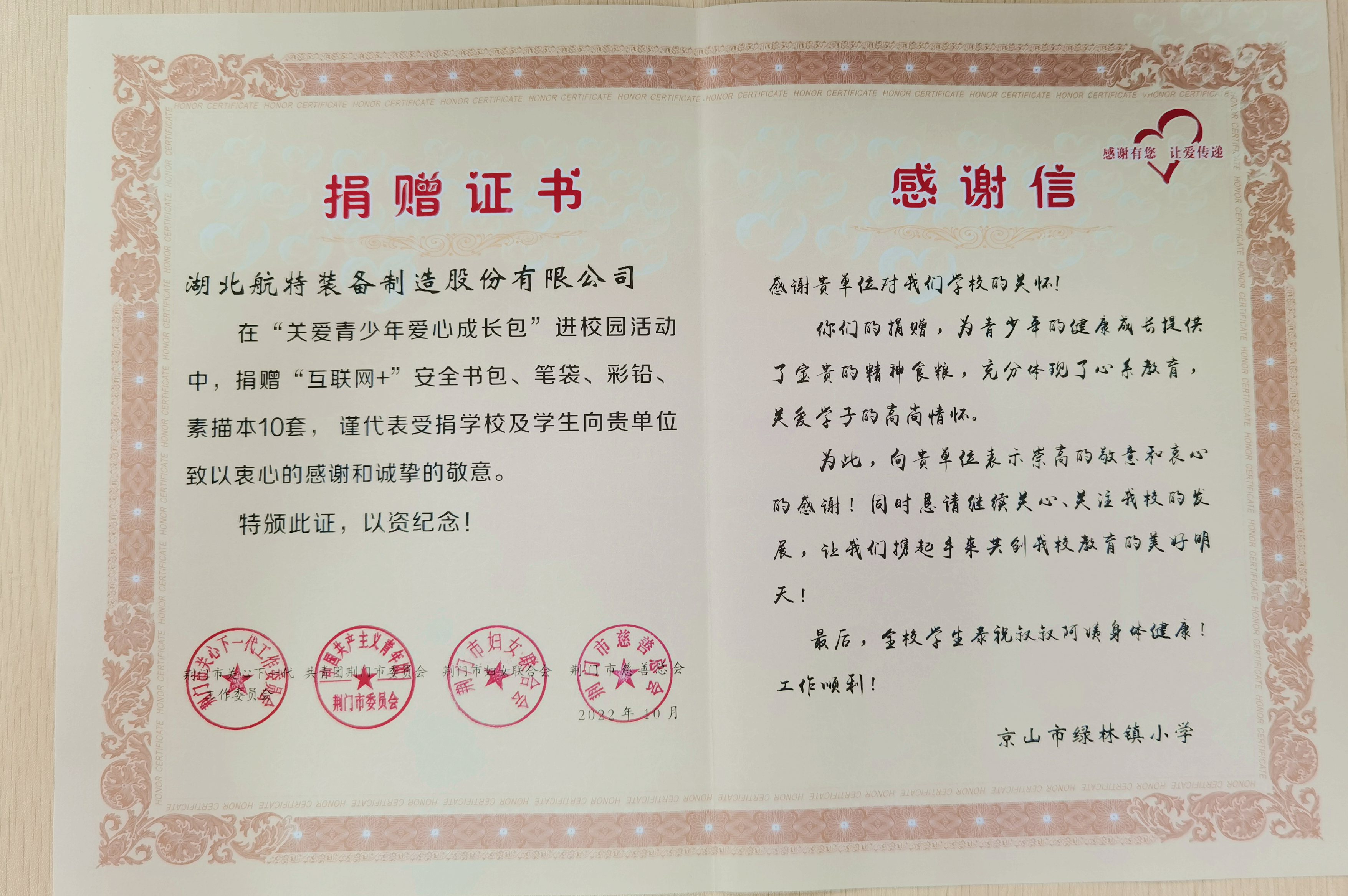 積極支持國家扶貧戰略,相繼為漳河鎮袁沖村、麻城鎮鄧沖村和市健康扶貧醫療基金捐款25萬元;為京山市綠林小學捐贈愛心成長包;2020-2022三年疫情期間,在保障員工基本利益的情況下,力保主要客戶供貨,同時為客戶、社會捐贈愛心款和防疫器材,彰顯航特擔當。
